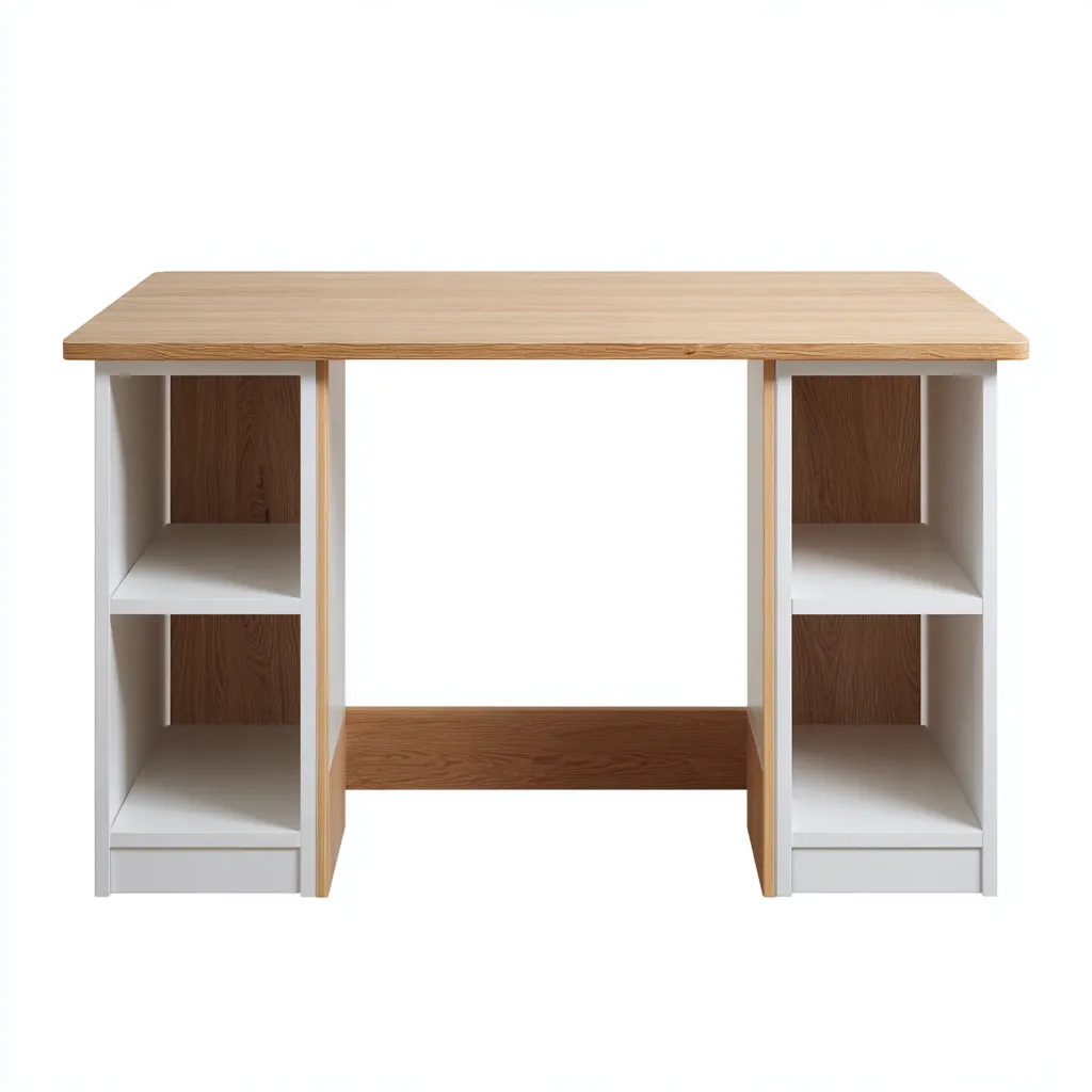 Le bureau est équipé de compartiments de rangement ouverts intégrés de chaque côté, facilitant l'organisation des livres, dossiers ou accessoires de bureau.
