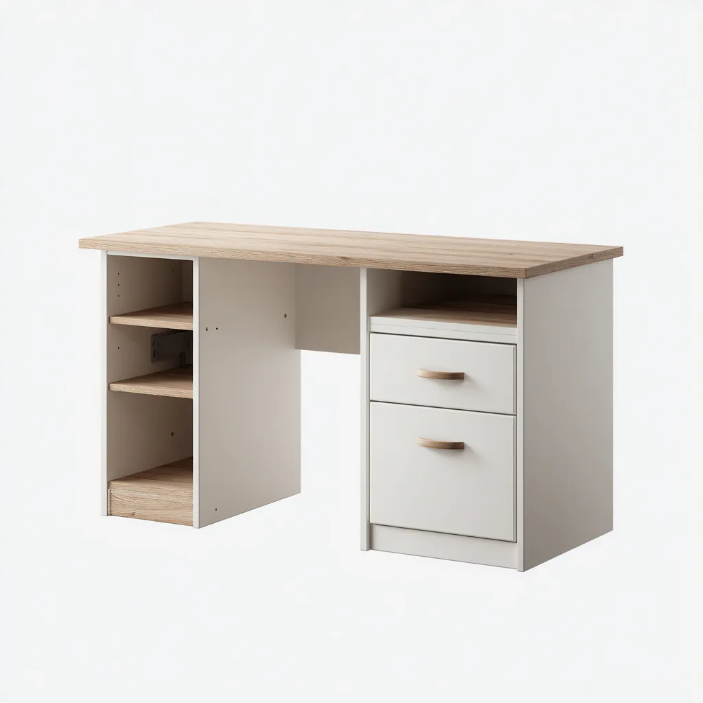La structure est réalisée en panneaux de bois avec une finition blanche, associée à un plateau effet bois clair. L'ensemble offre une surface stable et adaptée à un usage quotidien.