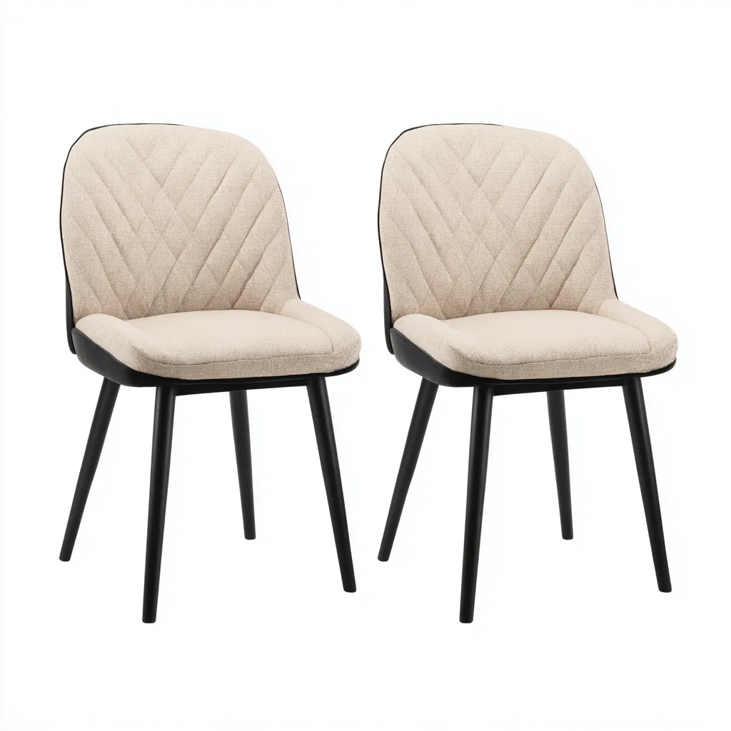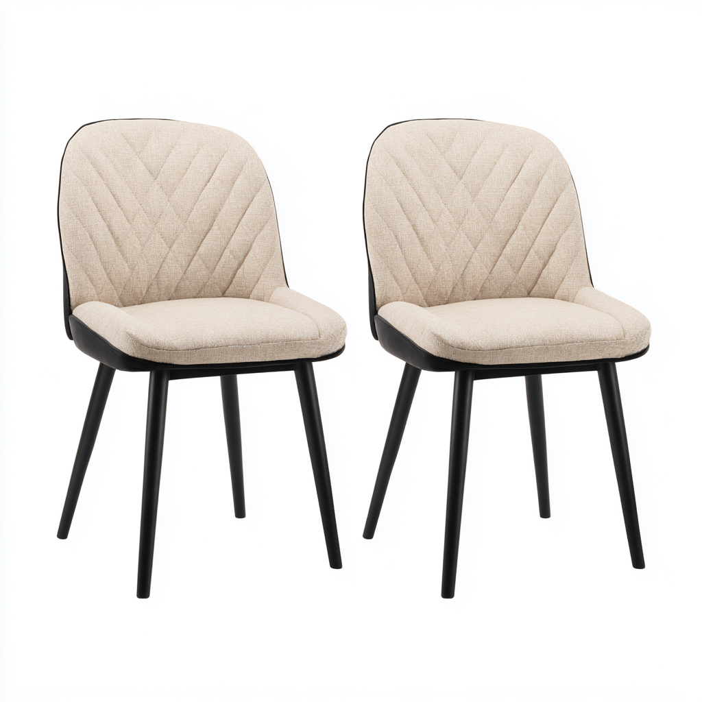 L'assise et le dossier sont recouverts d'un tissu beige matelassé, tandis que la structure repose sur des pieds en métal finition noire assurant stabilité et durabilité.