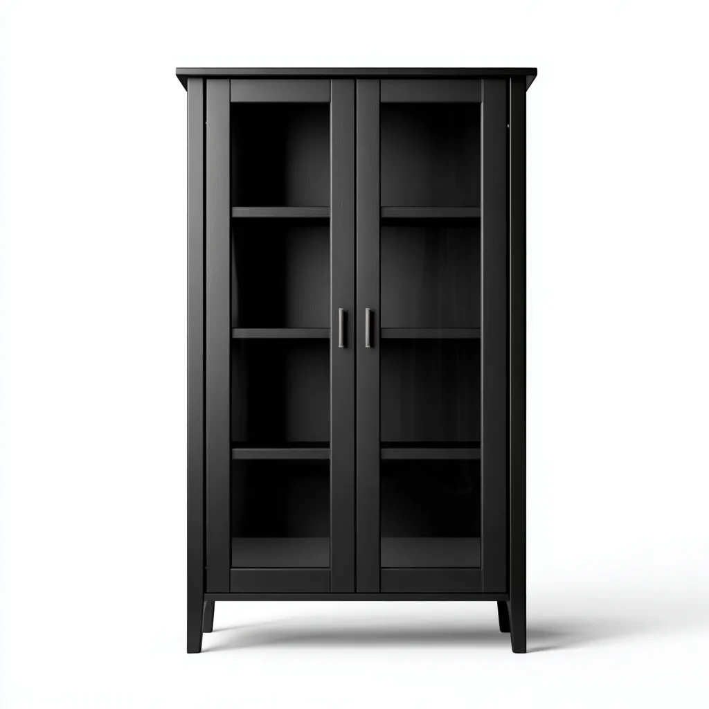 La structure est réalisée en bois avec une finition noire mate. Les portes vitrées permettent une visibilité claire du contenu tout en protégeant les objets.