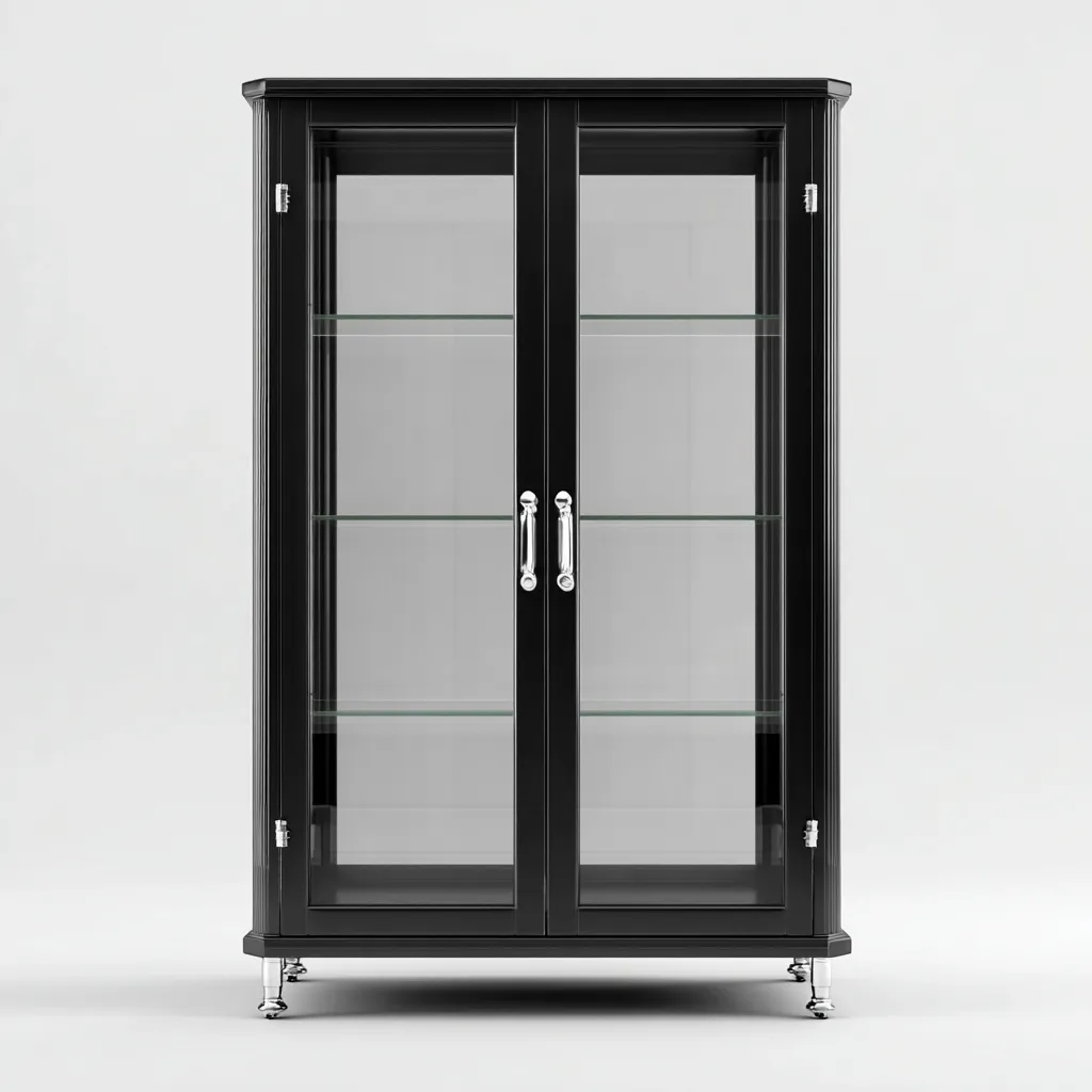 La structure est réalisée en bois avec une finition noire uniforme. Les portes vitrées et les étagères en verre permettent une visibilité claire du contenu. L'ensemble est conçu pour une utilisation intérieure stable et durable.