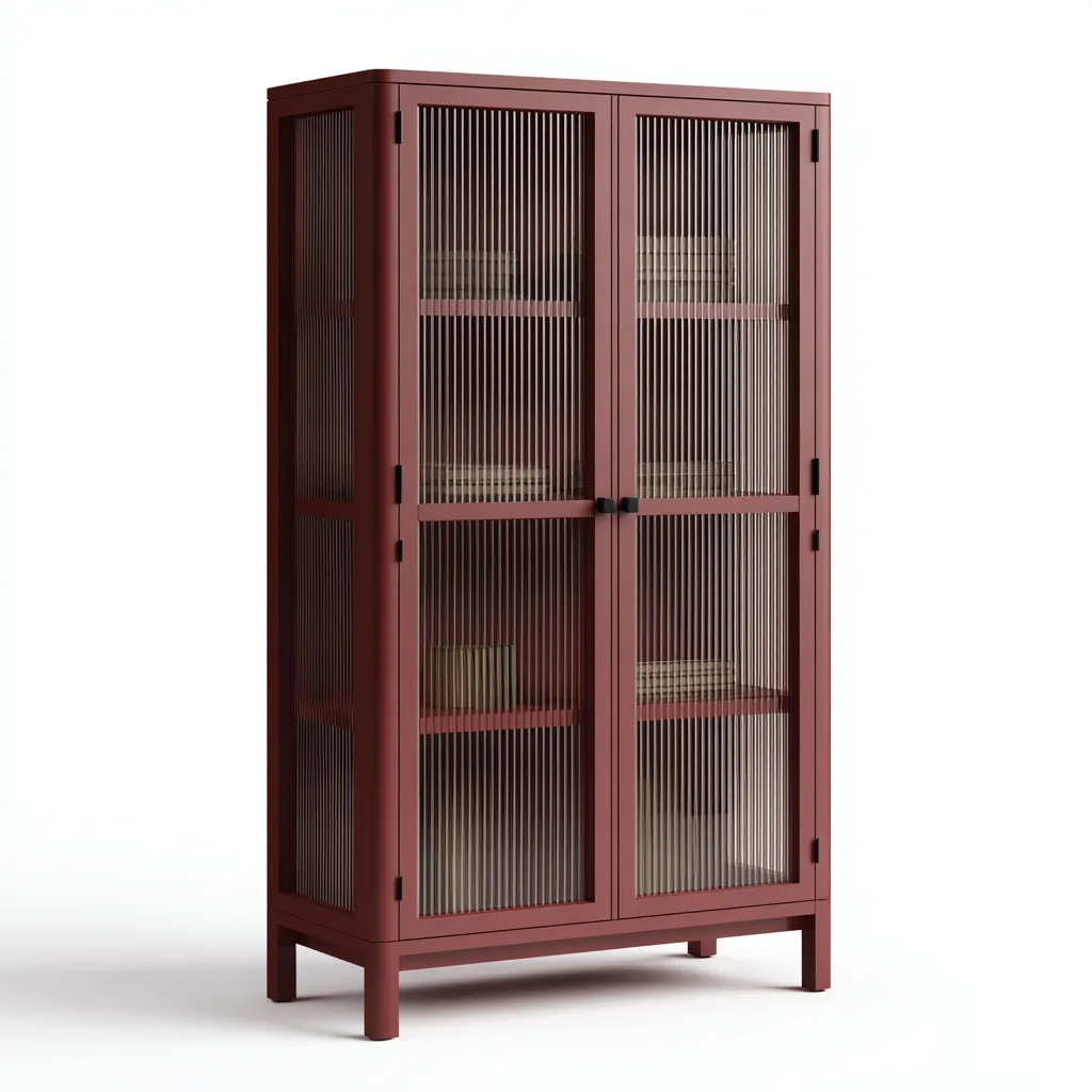 La structure est réalisée en bois finition bordeaux, associée à des portes en verre nervuré qui laissent apparaître le contenu tout en préservant une certaine discrétion visuelle.