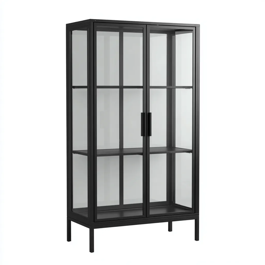 La structure est conçue en métal finition noire, associée à des panneaux en verre transparent offrant une visibilité optimale du contenu.