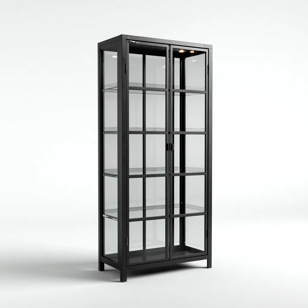 La structure est réalisée en métal à finition noire, offrant une bonne stabilité et une esthétique épurée. Les panneaux et étagères en verre transparent assurent une visibilité optimale du contenu et renforcent l'aspect léger de l'ensemble.